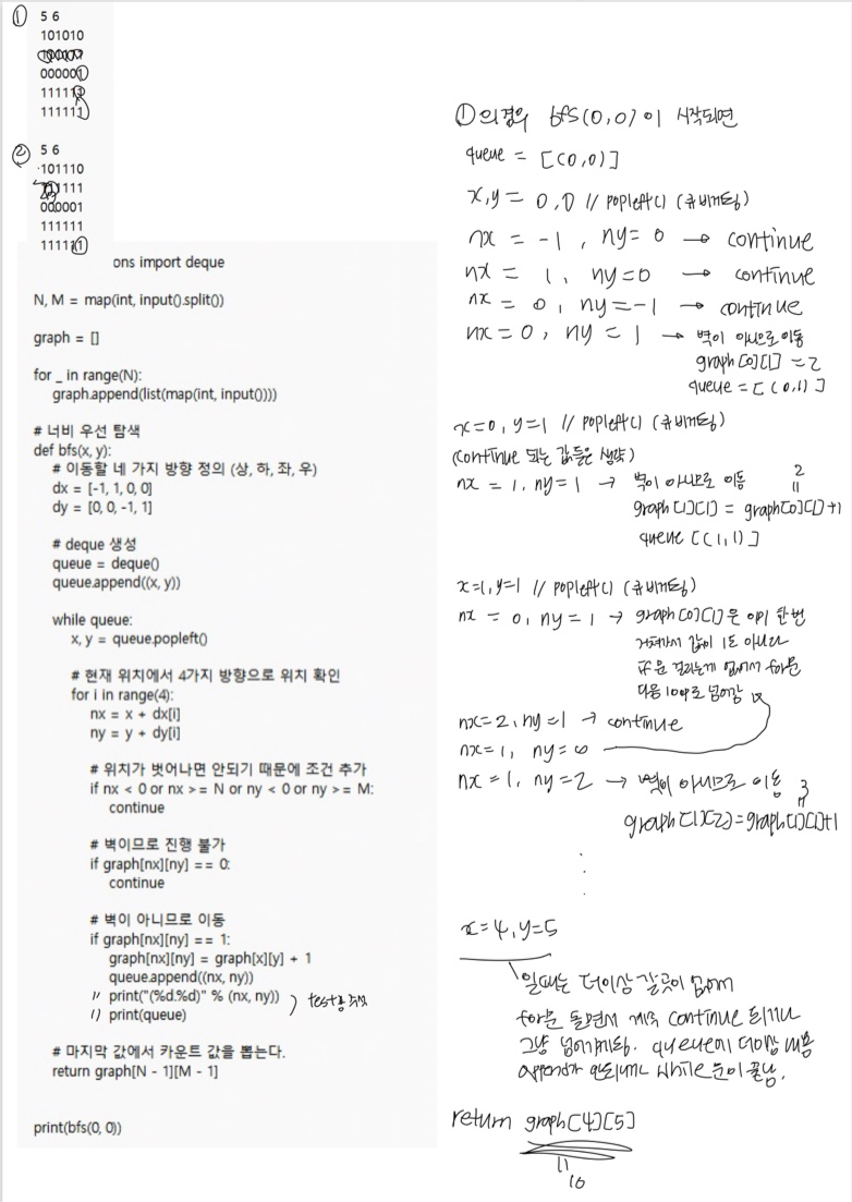 BFS가 시작 지점에서 가까운 노드부터 차례로 그래프의 모든 노드를 탐색하기 때문에 해당 문제에 적합하다고 책에 나와있는데 가까운 노드가 모두 1이면 모든 노드를 다 탐색하고 돌고돌아 목적지에 가게 되는거 아닌가??라는 생각이 들어서