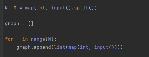 그 후 행의 수만큼 열의 값을 입력받아 graph 리스트에 저장한다. 해당 부분을 아래에서 자세히 보겠다.