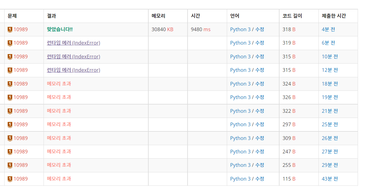 이렇게 그냥 파이썬 기본 내장 함수를 이용하면 메모리 초과가 발생한다.