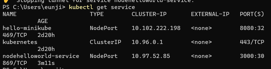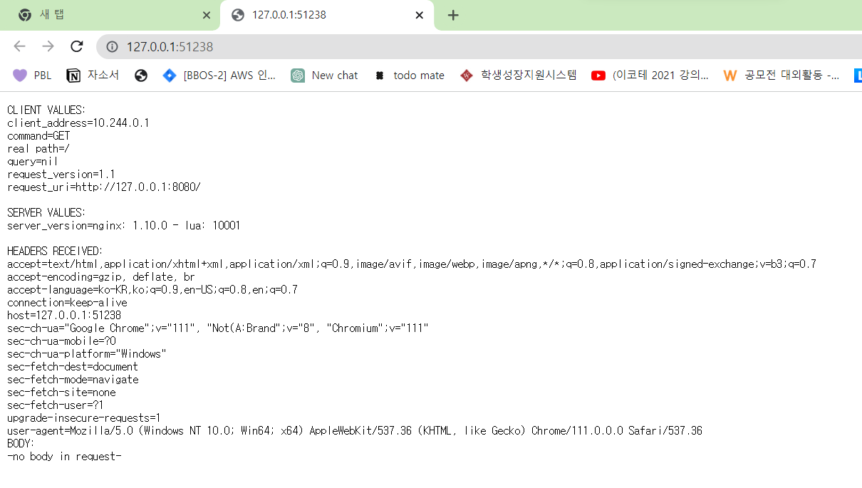 minikube service hello-minikube 로 에코 서비스에 접근할 수 있는 포트와 ip 주소 확인 후 접속